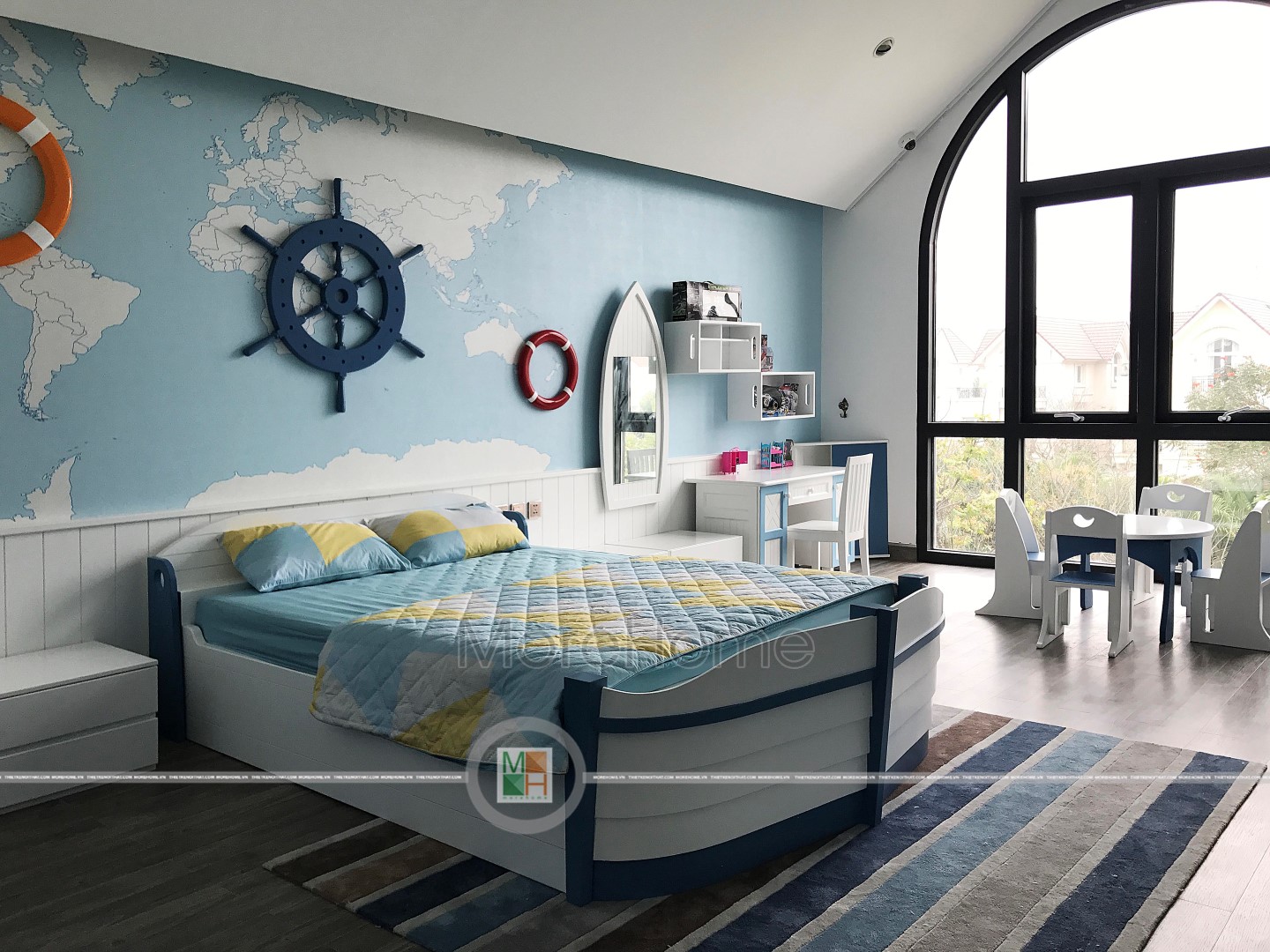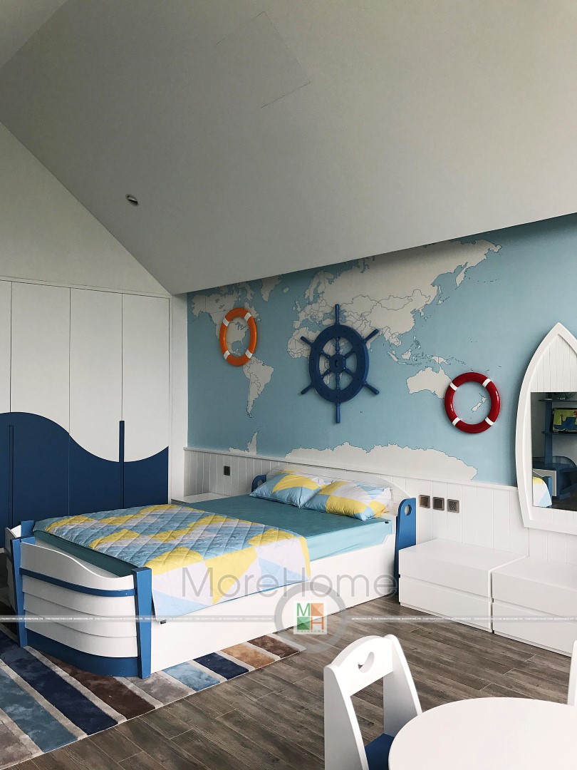 Đây là phòng ngủ cho bé trai, kiểu dáng giường, bộ bàn ghế học tập và vui chơi,... được thiết kế thi công dựa theo ý thích của bé, giúp bé thoải thích với trí tưởng tượng của những chuyến phưu lưu đầy khám phá thiết kế màu xanh làm màu chủ đạo