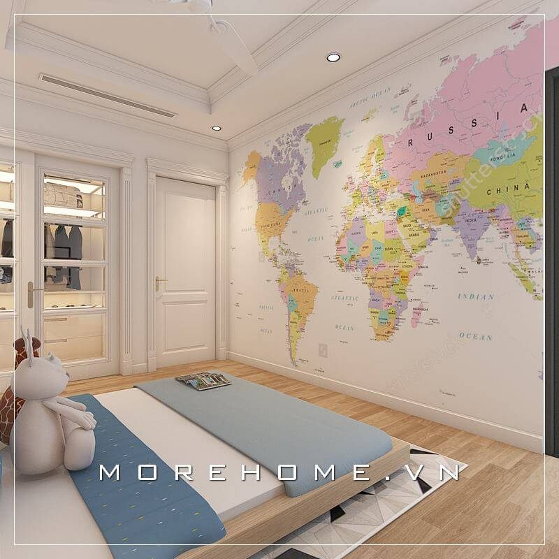 Thiết kế nội thất phòng ngủ bé trai trong không gian biệt thự cùng cách trang trí bức tường bản đồ thế giới giúp con phát triển trí thông minh và năng động hơn.