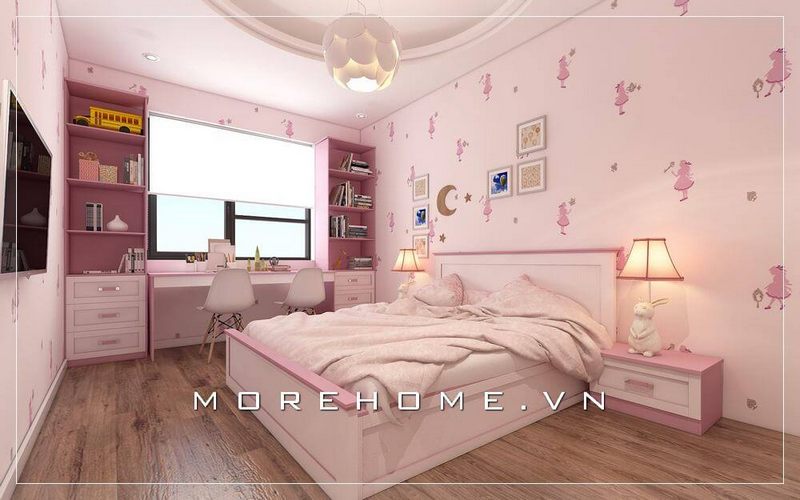 Nội thất phòng ngủ bé gái dễ thương với tone màu hồng chủ đạo, chất liệu gỗ công nghiệp nhẹ nhàng, trẻ trung cũng là sự lựa chọn không tồi đâu nhé!