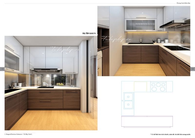 Tủ bếp hiện đại kiểu chữ L có 2 màu sắc khác biệt trên dưới tránh làm không gian bị nhàm chán được thiết kế dành cho phòng bếp của chung cư