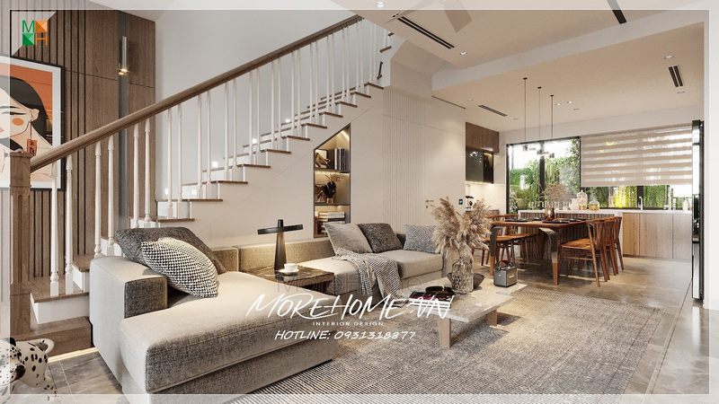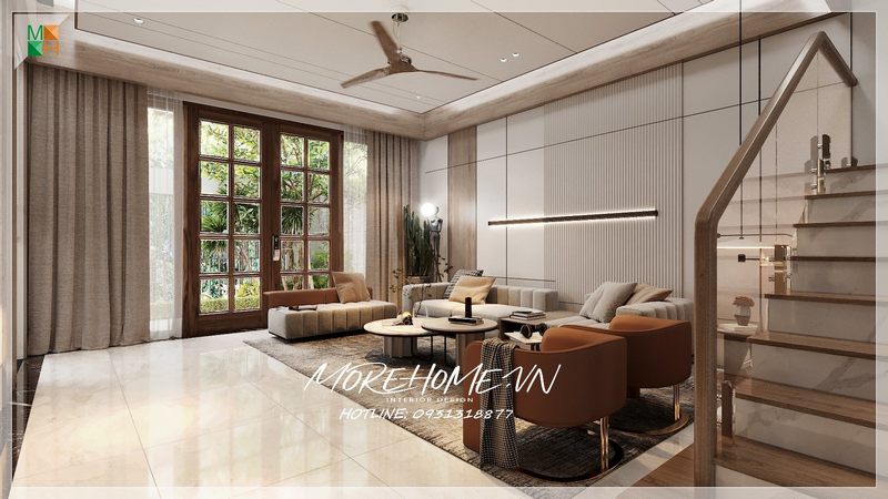 Không gian phòng khách biệt thự được thiết kế hướng đến sự nhẹ nhàng với nội thất hiện đại và các trang trí đơn giản tạo cảm giác thoải mái và sang trọng trong không gian sinh hoạt chung của gia đình