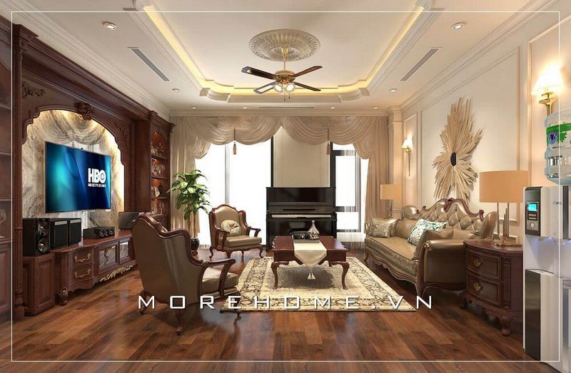 Morehome - Đơn vị thi công nội thất phòng khách gỗ tự nhiên tân cổ điển sang trọng đẹp tại biệt thự Ecopark Hưng Yên