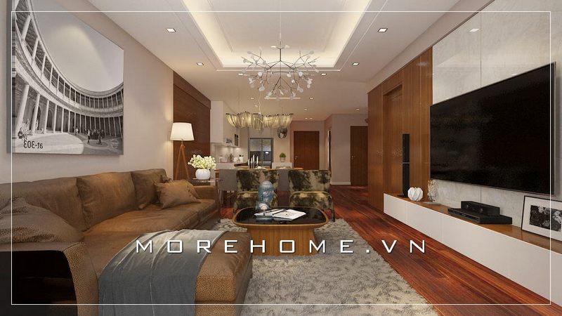 Mẫu thiết kế phòng khách chung cư đẹp với cách sắp xếp nội thất gọn gàng ngăn nắp, với tông màu nâu vàng của gỗ mang đến sự ấm ấp gần gũi cho không gian căn phòng