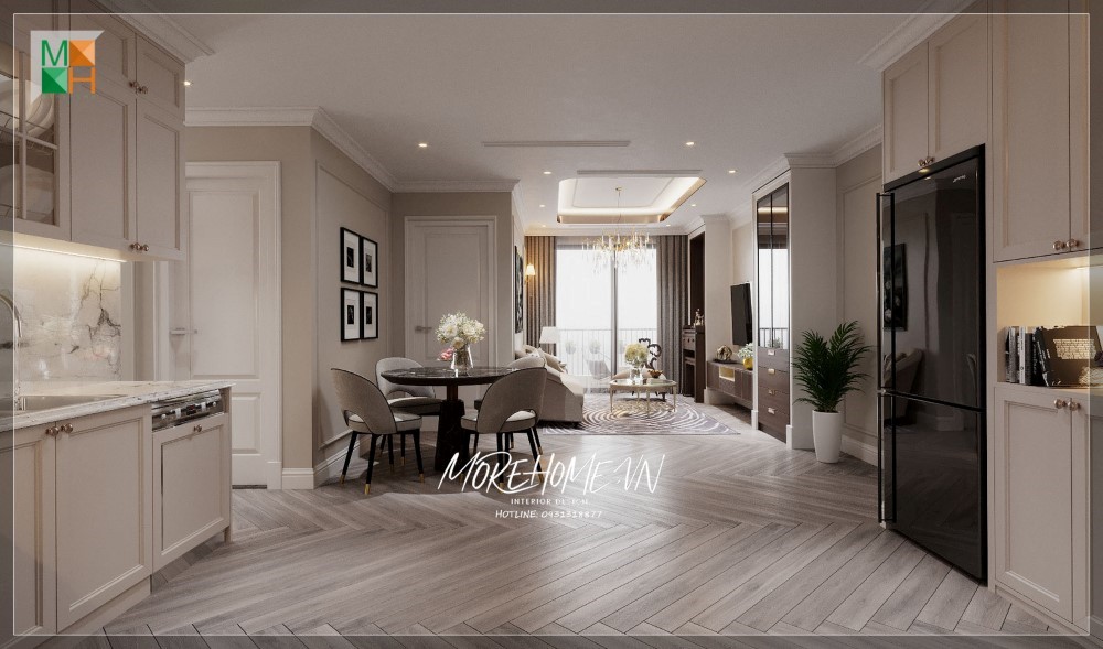 Mẫu thiết kế phòng khách liền kề bếp tân cổ điển và được ngăn cách bởi bộ bàn ăn đang được nhiều gia chủ ưa chuộng và sử dụng cho không gian sinh hoạt chung tiện nghi hơn.