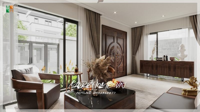 Thiết kế không gian phòng khách biệt thự gỗ óc chó mang đến sự sang trọng, đẳng cấp cho không gian sống của gia đình.