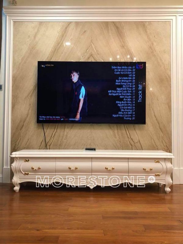 Kệ ti vi màu trắng ấn tượng được coi là điểm nhấn nổi bật cho không gian phòng khách thêm sang và tinh tế hơn