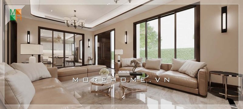 Ghế sofa phòng khách của biệt thự cao cấp được bố trí theo hình chữ U, tạo nên một ấn tượng sâu sắc. Thiết kế hiện đại, kết hợp với các tone màu trung tính giúp tạo nên một cảm giác sang trọng và tinh tế.