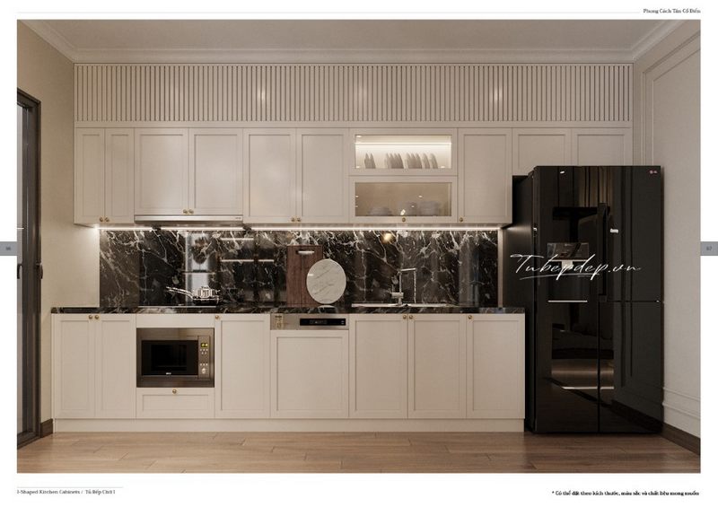 Thiết kế tủ bếp với hệ thống tủ chữ i tiện lợi và tiết gọn gàng màu trắng tinh tế kiểu tân cổ điển giản lược tạo cảm giác thoáng đãng cho không gian