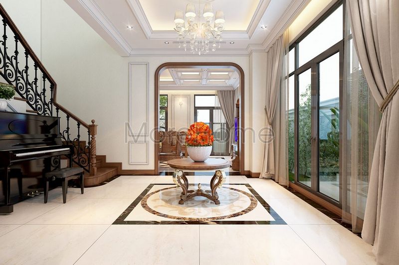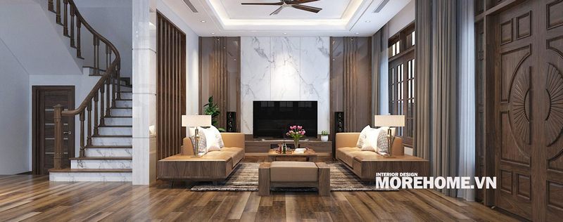 Thiết kế cầu thang gỗ óc chó đổi chiều 180 độ nên sử dụng đá ốp màu trắng ở cổ bậc để đem lại sự sang trọng và chắc chắn.