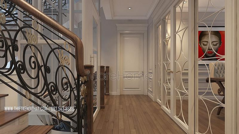 Vẻ đẹp đầy ấn tượng trong từng chi tiết của thiết kế cầu thang gỗ óc chó kết hợp phên sắt uốn đầy nghệ thuật.